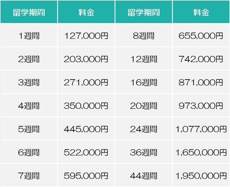 特徴 | 業界最安値保証! 全学校が同一価格 | 2カ国留学に強い! 全員10万円割引! | Google口コミ評価No.1 |