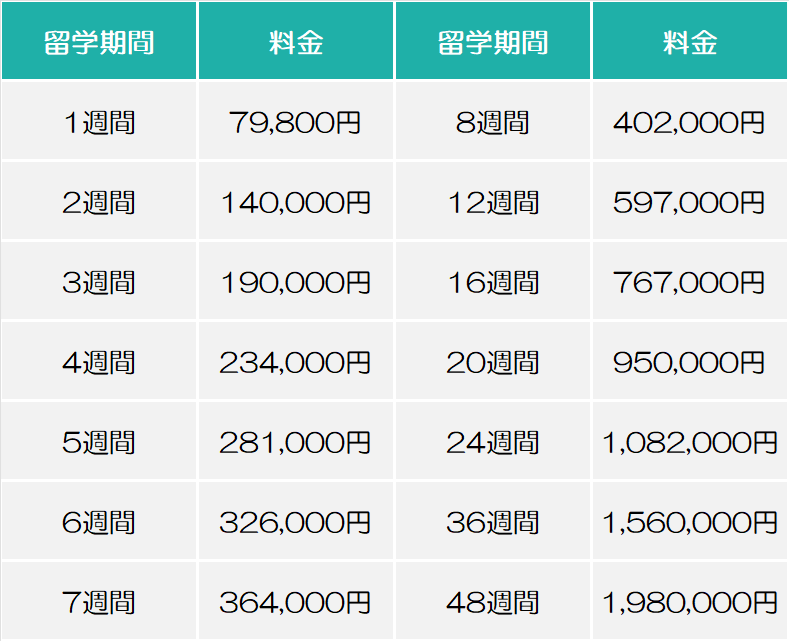 特徴 | 業界最安値保証! 全学校が同一価格 | 2カ国留学に強い! 全員10万円割引! | 留学前のオンライン英会話が無料! |